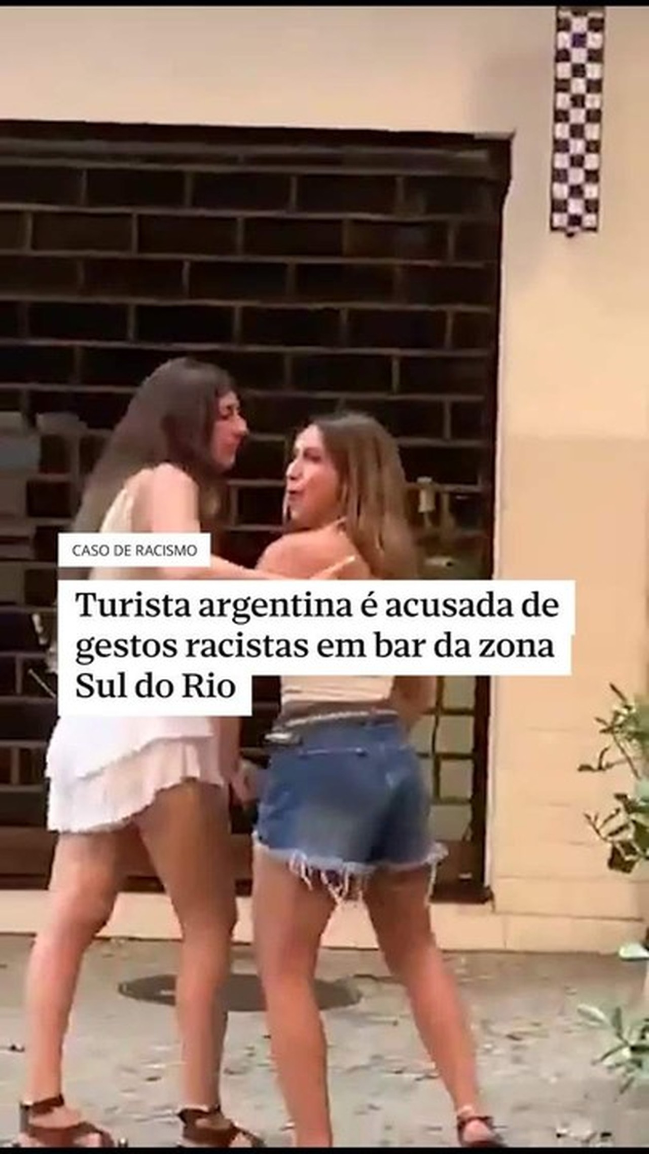 A argentina de 29 anos, que é influenciadora e advogada, foi filmada imitando gestos de macaco, ato considerado racista, para um atendente do Barzin Ipanema, na Rua Vinícius de Moraes. O vídeo ganhou repercussão nas redes sociais na semana passada e motivou a instauração de uma investigação policial. À polícia, ela declarou que não sabia que o gesto configurava crime no país e que se tratava de uma “brincadeira” direcionada às amigas.